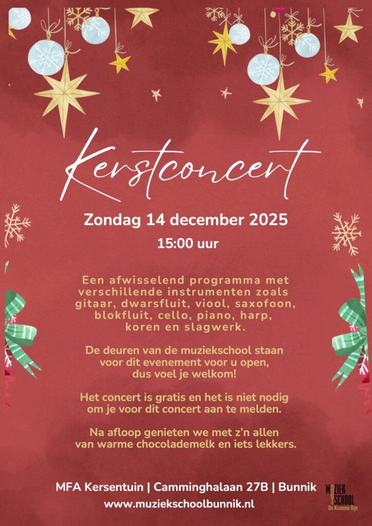 Zondag 14 december 2025 vindt het jaarlijkse kerstconcert plaats. Het is in de muziekschool en begint om 15:00 uur. Het is altijd een sfeervol concert, zo in deze donkere tijd van het jaar. Leerlingen spelen mooie muziek. Iedereen is al druk bezig met repeteren. Er zijn veel verschillende instrumenten. Ook het koor laat van zich horen. Na afloop van het concert is er voor iedereen warme chocolademelk.